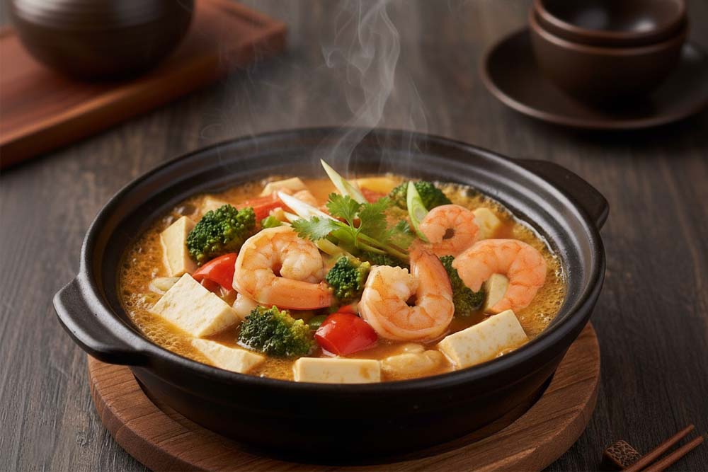 2.鍋中熱油爆香薑片,放入蝦仁快炒,加入豆腐、醬油和少許清水,煨煮約 3 分鐘,最後撒上蔥花即可上桌。