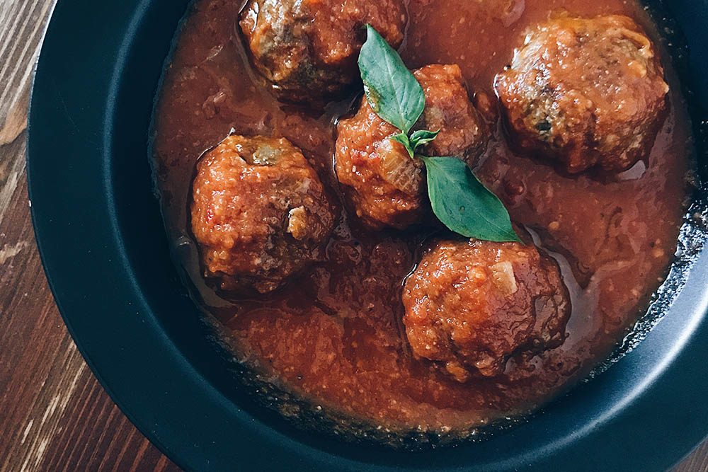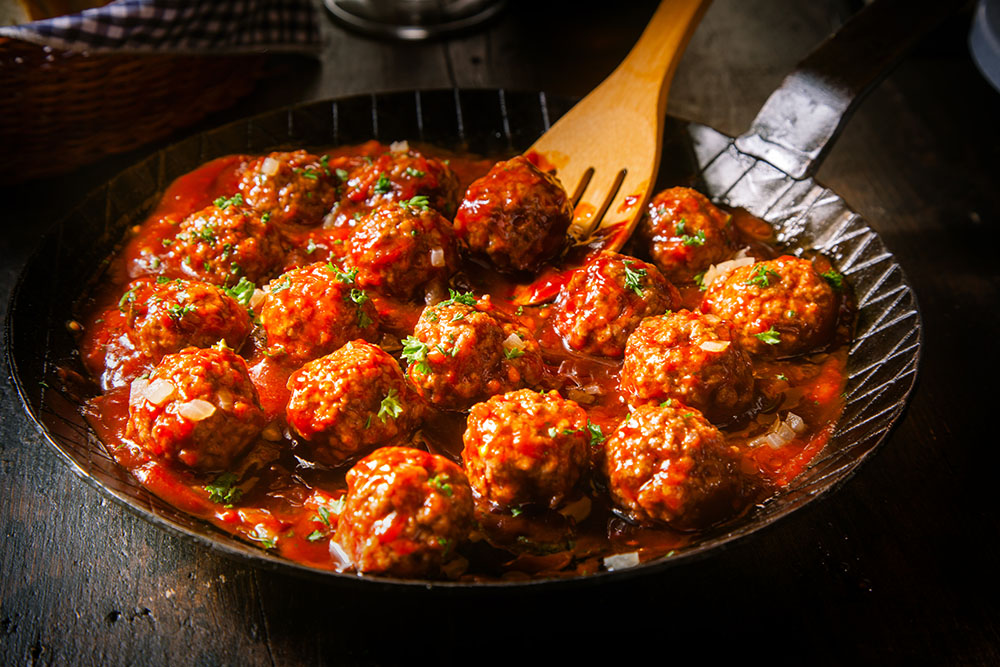 8.接著倒入蕃茄醬汁,與肉丸一起燉煮約20分鐘至醬汁濃稠即可。