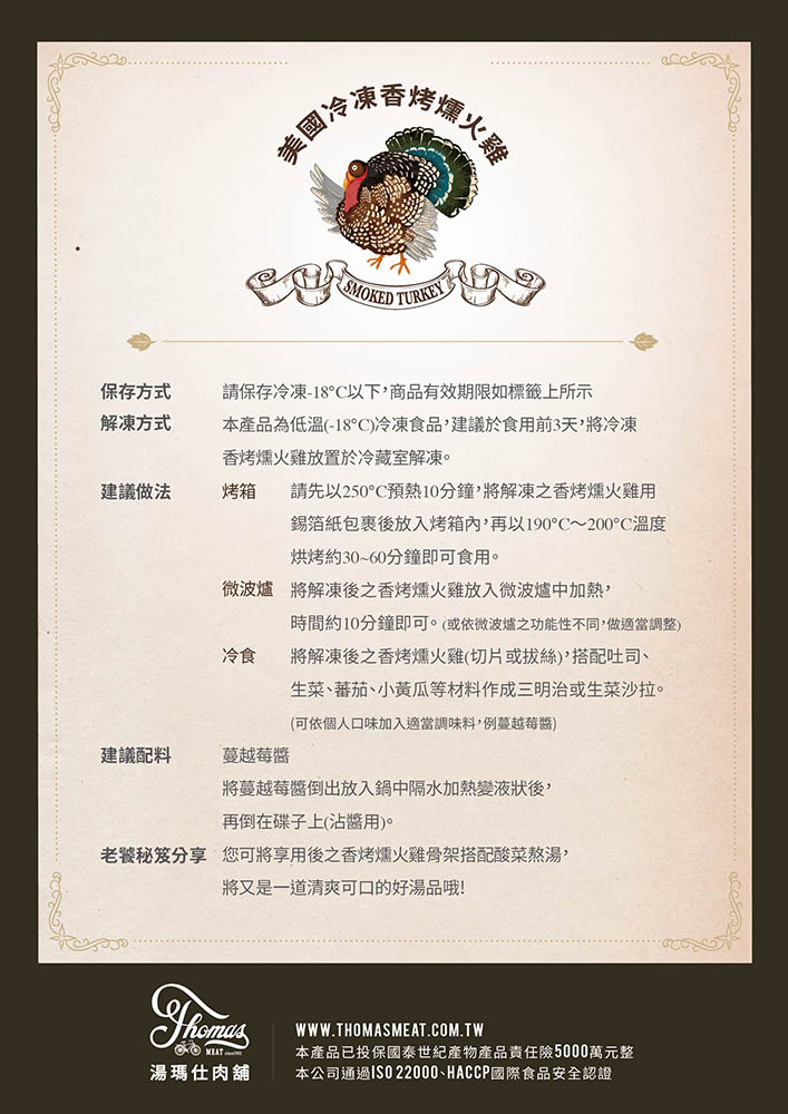 打破對火雞的印象!湯瑪仕肉舖季節限定冷凍櫸木煙燻火雞,不只鮮嫩、多汁,而且香氣獨樹一幟,解凍後加熱即可直接食用,沾醬、拌沙拉、做成三明治或熬湯也都相當美味。